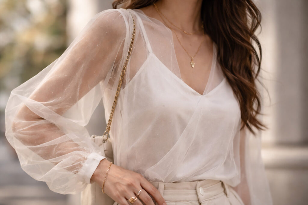 Una de las formas más sencillas de incorporar esta tendencia es a través de blusas ligeras con transparencias en mangas o escotes. Estas piezas aportan un toque femenino y moderno sin resultar excesivas. Combinadas con pantalones de tiro alto o faldas estructuradas, consiguen un look pulido ideal tanto para la oficina como para una salida informal.